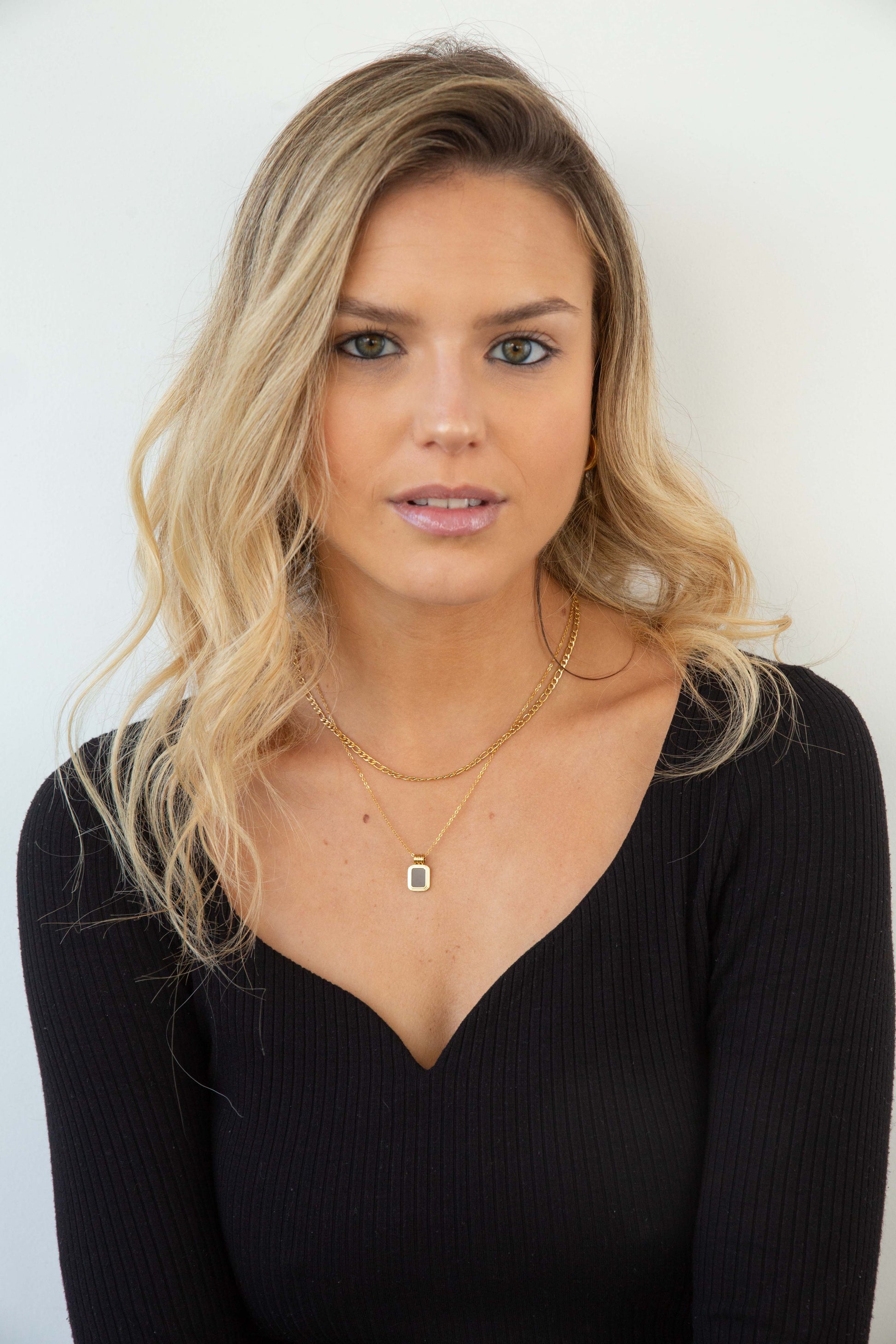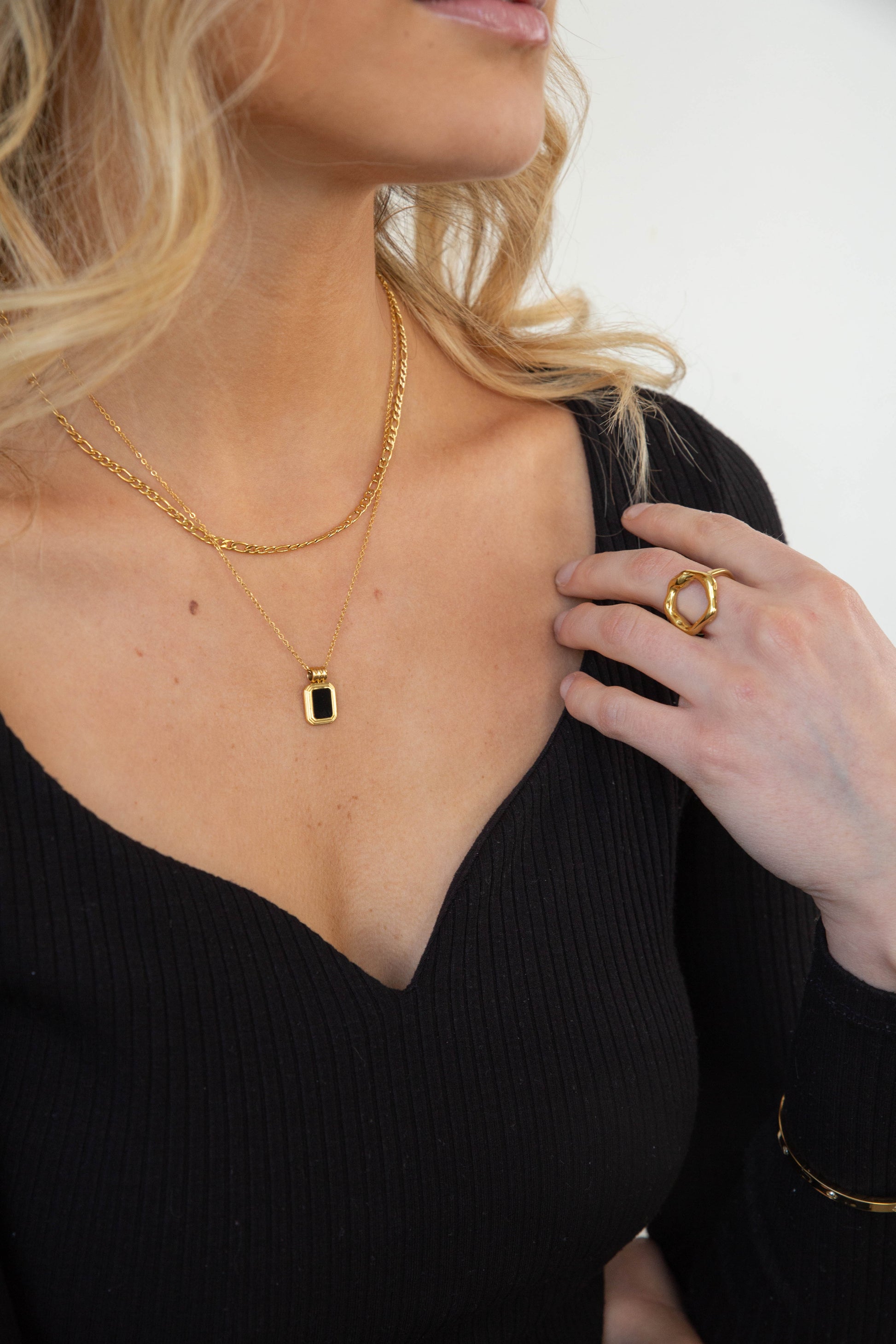 Si eres fan de combinar collares, Antonia es para ti. Collar doble de acero inoxidable bañado en oro 18k, con piedra cuadrada